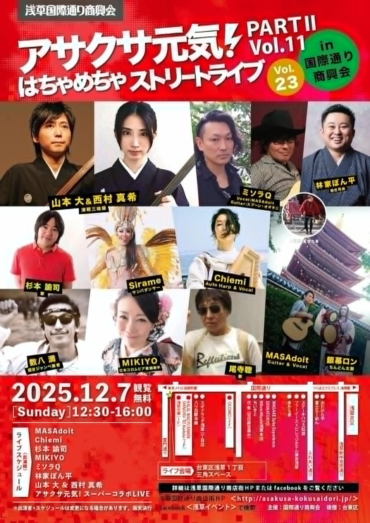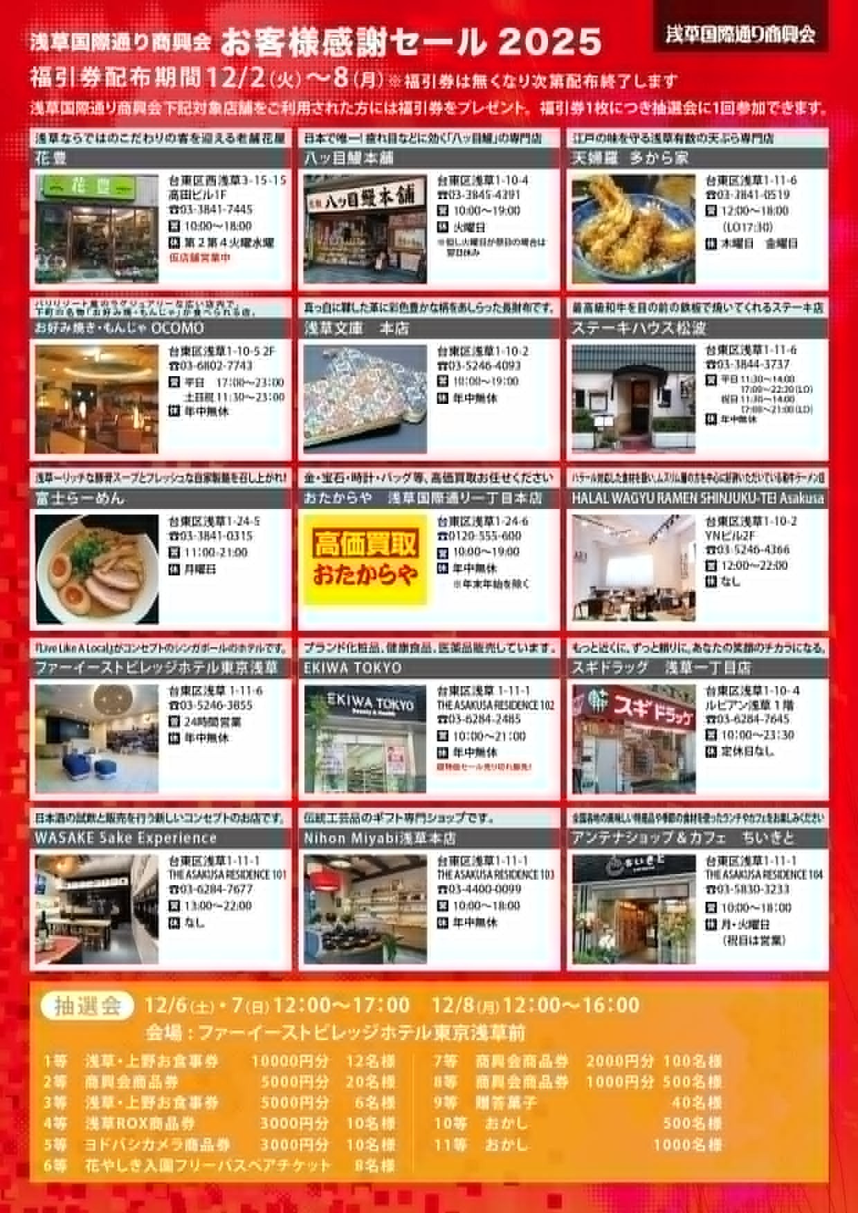国際通り商興騎会 お客様感謝セール抽選会、アサクサ元気はちゃめちゃストリートライブが開催されます。 12月6日(土)~12月8日(月) 国際通り商興騎会 お客様感謝セール抽選会を行います。 商興会共通商品券他豪華景品当選確率が高い!です。 この機会に下記店舗ご利用くださいませ。 また、12月7日(日曜日)は12:30~浅草文庫前でアサクサ元気はちゃめちゃストリートライブも行われます。 観覧無料です!遊びに来てください。